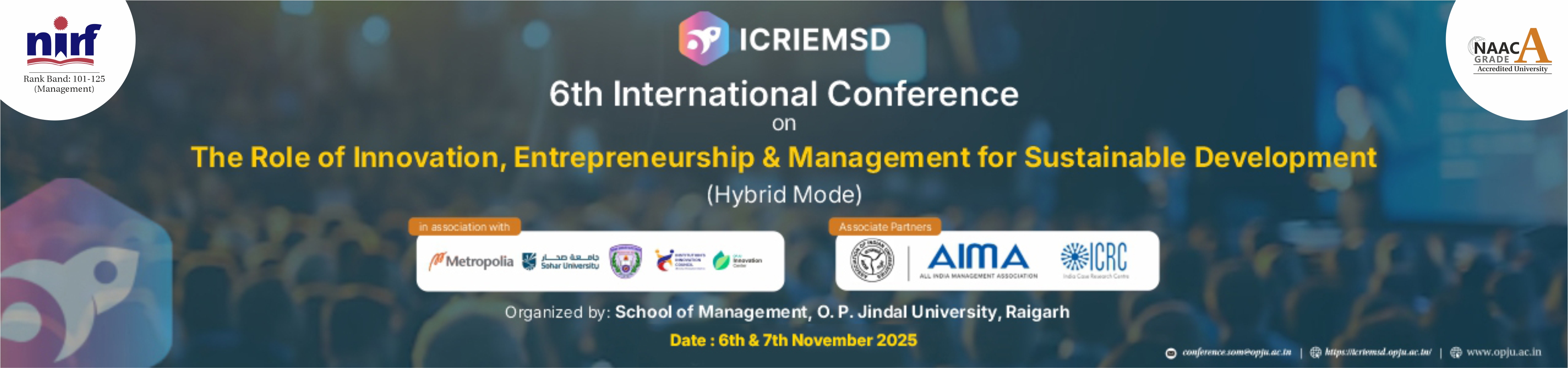The 6 th International Conference on Role of Innovation, Entrepreneurship and Management for Sustainable Development aims to bring together academicians, researchers, industry experts and students to exchange and share their experiences and research results on all aspects of Innovation, Entrepreneurship, Management and Information Technologies. This conference will provide a premier interdisciplinary platform to all the participants to present and discuss the most recent innovations, trends and concerns in the fields of Innovation, Entrepreneurship, Management and Information Technology.